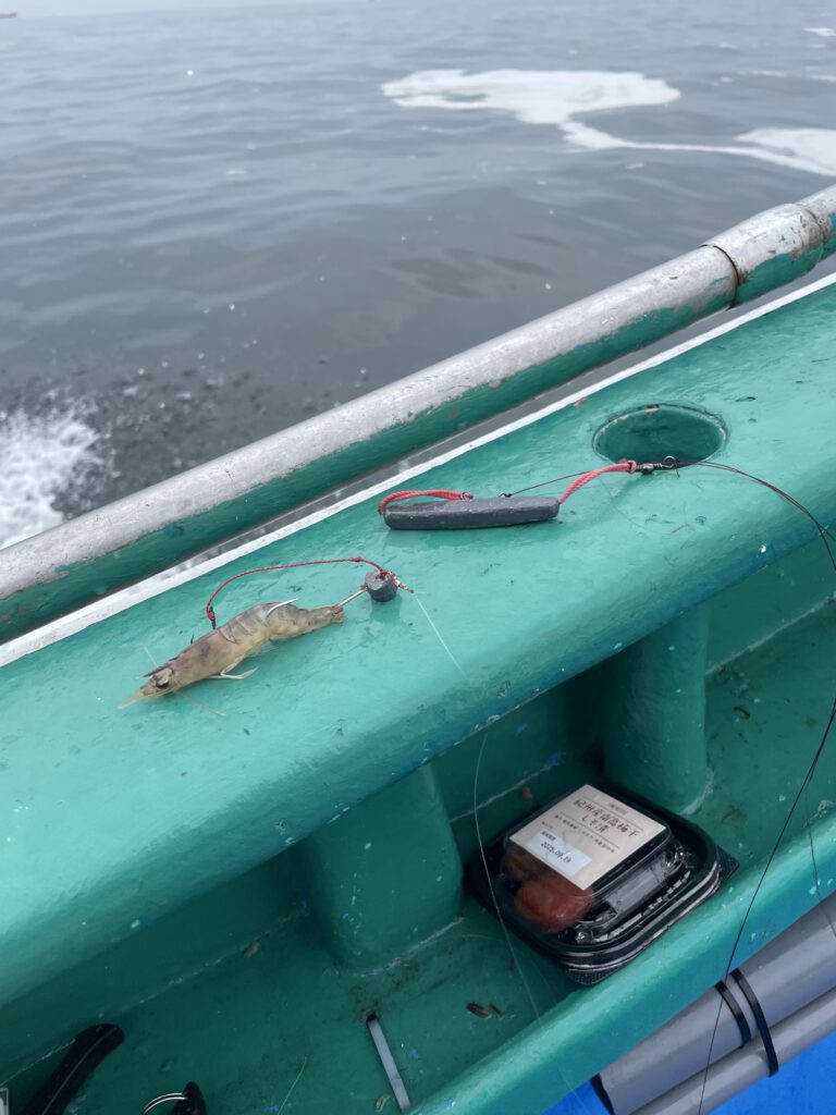 さて、実釣法だが、まず、豆テンヤを可能な限り投げて投入する。そのあと、中錘を豆テンヤからできるだけ、離れた場所に投げる。この距離が重要である。というのも、テーリング防止や誘い時の動きにもろに影響が出るからだ。投げる向きはその時々で上げ潮、下げ潮に合わせて船長からアドバイスがあるのでそれに従うのが吉。船長いわく、ここで釣果が変わるという。投げ終えたらそこから指示ダナ(船長から何ヒロという指示がある)まで落とす。指示ダナまで落としてから少し待つ。ここですぐにシャクリ始めると、豆テンヤと中錘の距離が十分に離れていないがいためにテーリングを起こしてしまうので要注意。また、この「十分離れている」という感覚は軽くシャクった時の重みでなんとなくわかる程度なので、経験値が必要。慣れるまでは周りのベテラン釣り師の所作や船長のアドバイスで学ぶしかない。
