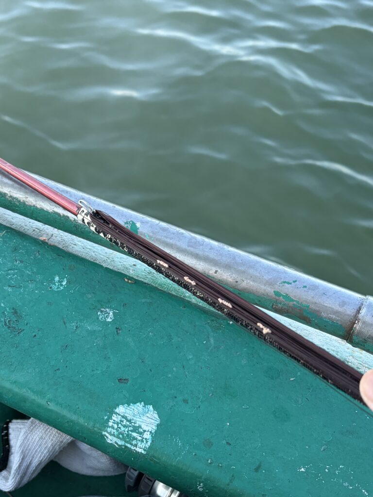 さらに大物がかかってしまって竿が耐えられないときは、尻手ロープというものを接続して(延長ロープと解釈してもらえれば大丈夫です)、一旦、竿を海に入れて、その延長ロープで駆け引きをするのだが、これをつけるのがまた、難しい。ここでもたついていると今度はラインブレイクが起こりやすい。自分もこのもたつきで何度も大物をばらしている。。。つまるところ、「ドラグ=自分の手で糸を引っ張ったり出したりする」のがこの釣りなのでドラグをガン締めしてファイトをしている状況を想像してもらえれば分かりやすいでしょう。特に浅場の型物は想像以上に引くので、5kgくらいのが釣れたと思ったら3kgくらいなんてこともザラである。