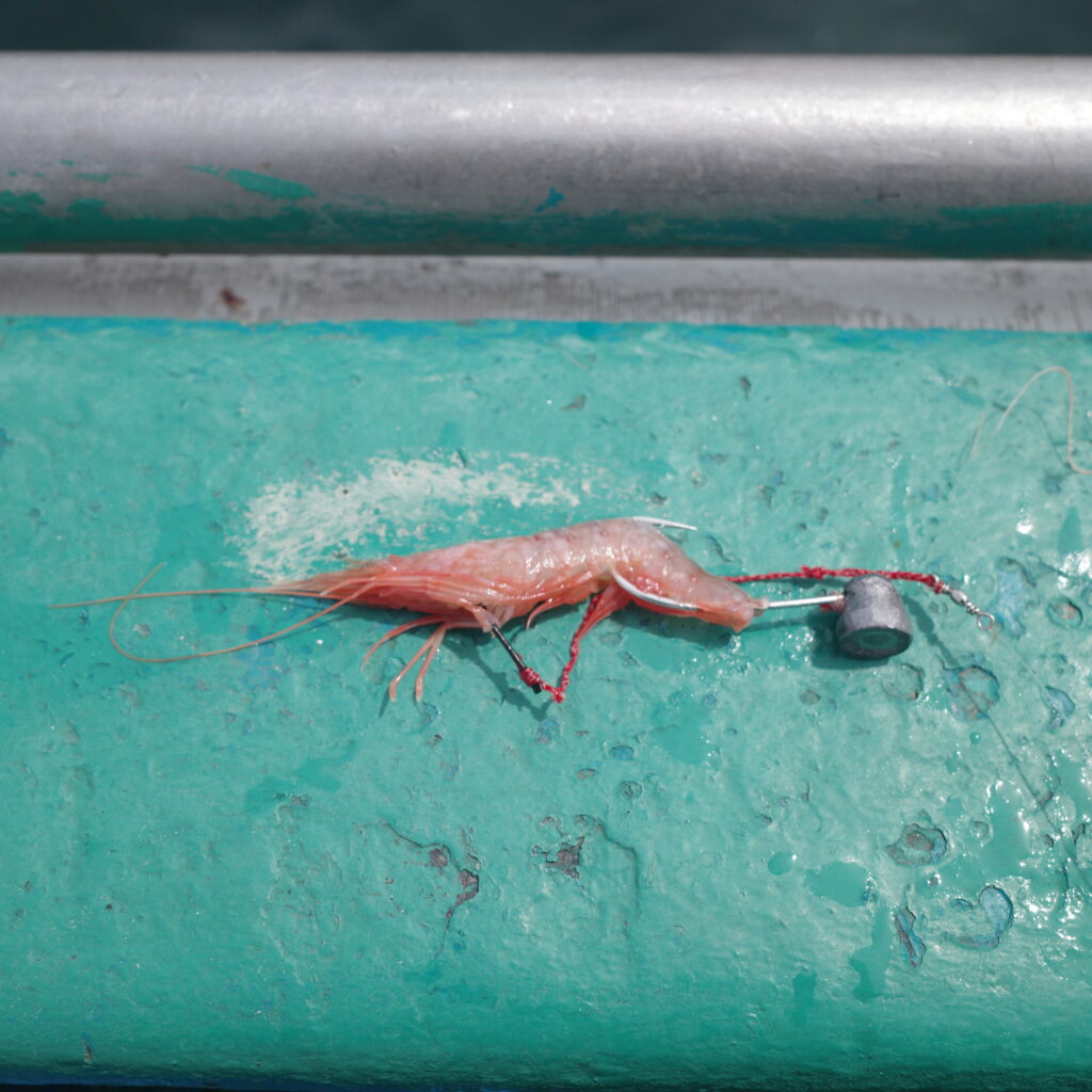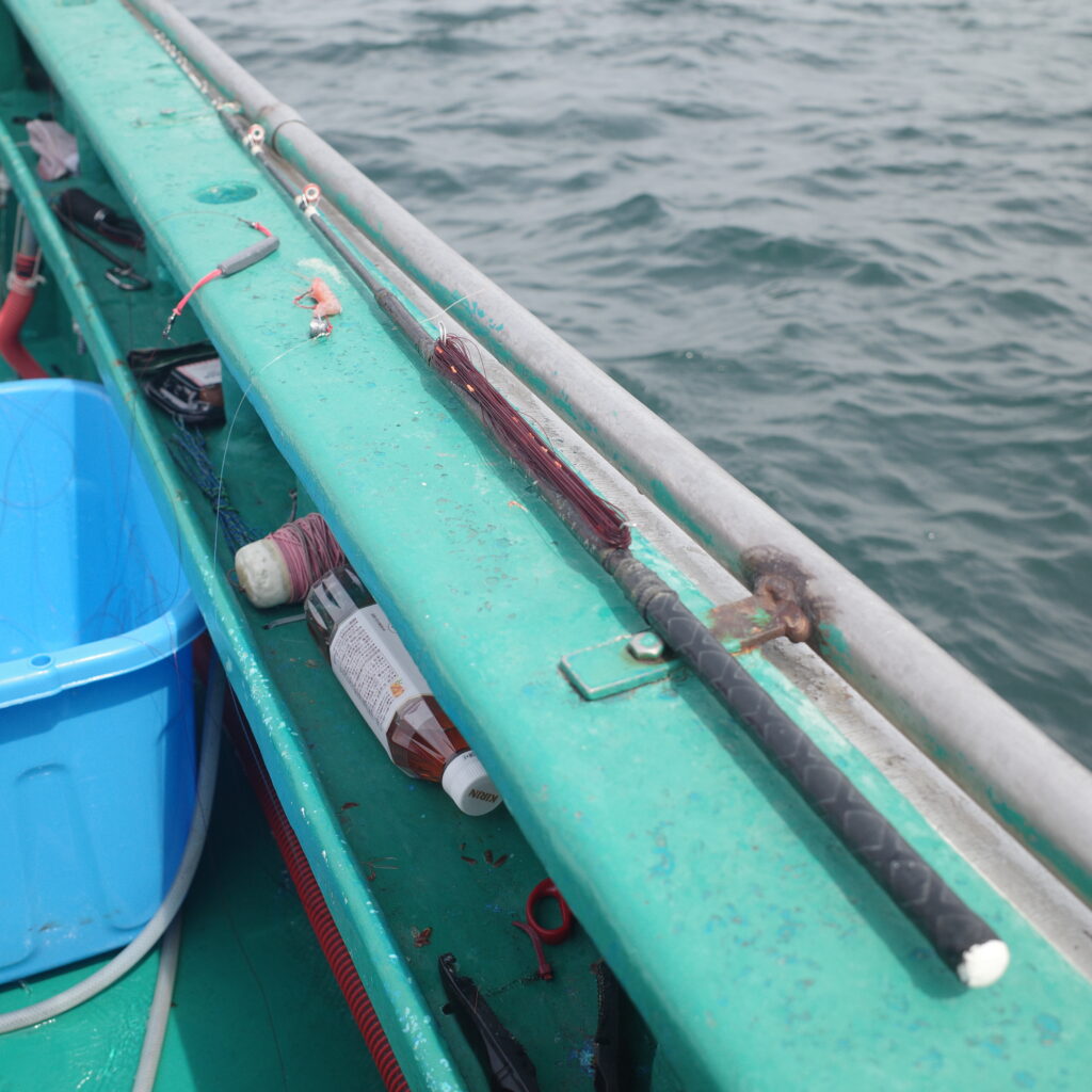 閑話休題、どういう釣りかという話に戻ろう。まず、タックルである。手バネと言われる竹やカーボンで作られた1.5m程度の竿に、ナイロンラージと言われるバーガンディ色の特殊なナイロン糸(8号くらい)が50ヒロ程度(1ヒロ1.5mなので、75m)ついており、その先に一旦、15号の中錘、そこから5号くらいの細いナイロンラージが3~4ヒロ、さらにフロロカーボンの2号くらいのハリスが付いて、2号の豆テンヤがつくという塩梅である。これをしゃくり上げては落としてステイの繰り返しで釣る。