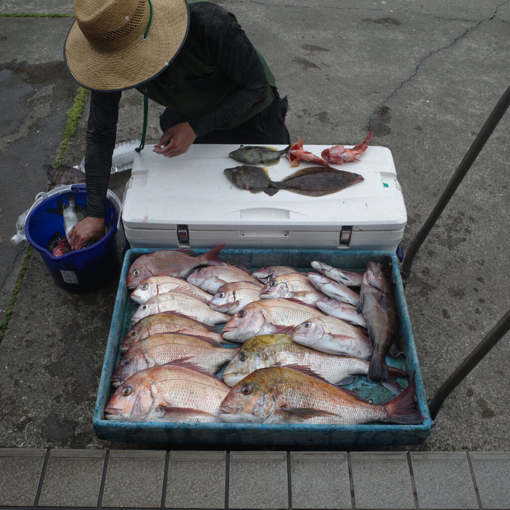 豊国丸の船長の腕は言わずもがななのだが、そのほかにも良いところがあるので、何点か記しておく。まず、手ぶらでいけることである。ライフジャケットの貸し出し(無料)はもちろん、エサや氷、貸し竿(テバネシャクリのみ)も無料である。また、魚をいれるクーラーも船で用意してある大型のものがあるので、釣れた魚は沖上がりまで生け簀にいれておき、最後に〆てクーラーにまとめて入れてくれる(自分が釣った魚が分かるように色付きの針金をもらうのでそれを魚に括り付けて他の乗船者の魚と混同しないようにできる)。ちなみに息子さんがいる時は、息子さんが手際よく、〆てくれるのだが、不在時は乗船者の中で若い人間がやらされる。ベテランが群雄割拠するこの船において、アラフォーの自分はありがたいとこに若い人間枠なので、帰港中の20~30分間で何十匹という魚を〆めることになり、港についたころには手も服も血みどろになっている。若い人が参加する場合、ここだけは覚悟したほうがいい。自分より若そうな子がいたらその子を遠慮なく船長に差し出すので、そういう嫌な人間がいたら僕だと思ってください(笑)。あと、前述の通り、生き餌がないこともあるので、〆エキスがあるといいかもしれない。